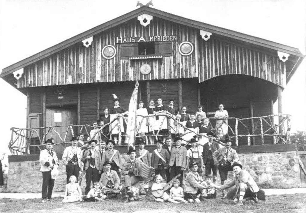 1909 wurde der Verein von Bayern gegründet, die ins Ruhrgebiet gekommen waren, um auf den Zechen und bei den Brauereien zu arbeiten. Mitglied konnte lange Zeit nur jeder gebürtige, männliche Bayer werden. Ziel war und ist es, Sitten und Bräuche der bayrischen Heimat auch in Westfalen zu leben. Innerhalb der Gaue gewann der Verein zahlreiche Plattlerpreise, deren Trophäen noch in der Hütte zu sehen sind. 1927 konnte der Verein nach einer Landwirtschaftlichen Wanderausstellung auf einem Nebengelände der Dortmunder Westfalenhallen eine original bayrische Almhütte kaufen und im Ardeygebirge wieder aufbauen. Pfingsten 1928 wurde "Haus Almfrieden" als Vereinsheim feierlich eingeweiht. 1939 wurde die tragende Holzkonstruktion der Hütte durch Mauerwerk ersetzt.1933 feierte der BVB ein 25-jähriges Jubiläum auch im Haus Almfrieden. 1955 erwarb der Verein die Schankerlaubnis und 1959 wurde der Dachstuhl angehoben, damit der Schlafsaal für die zahlreichen aus Dortmund anreisenden Mitglieder vergrößert werden konnte. Damit erhielt das Haus seine jetzige Grundform.